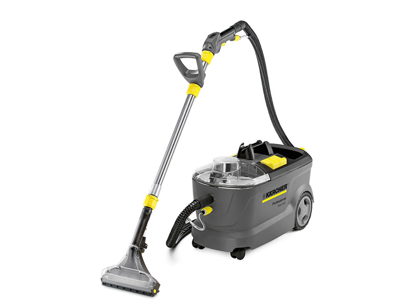 Puzzi 10/1 with upholstery nozzle and floor nozzle is particularly suited to hygienic and effective cleaning of small to medium surfaces. With 1 bar spray pressure, the spray extraction machine ensures gentle, deep cleaning of textiled surfaces and delivers impressive results, especially when cleaning carpets and upholstery. Thanks to the narrow floor nozzle, the machine is optimally suited for use in confined spaces. The flexible suction lips allow cluttered areas to be cleaned easily. The spray extraction machine is fitted with an integrated cable hook and a holder for a handle with trigger and suction pipe.