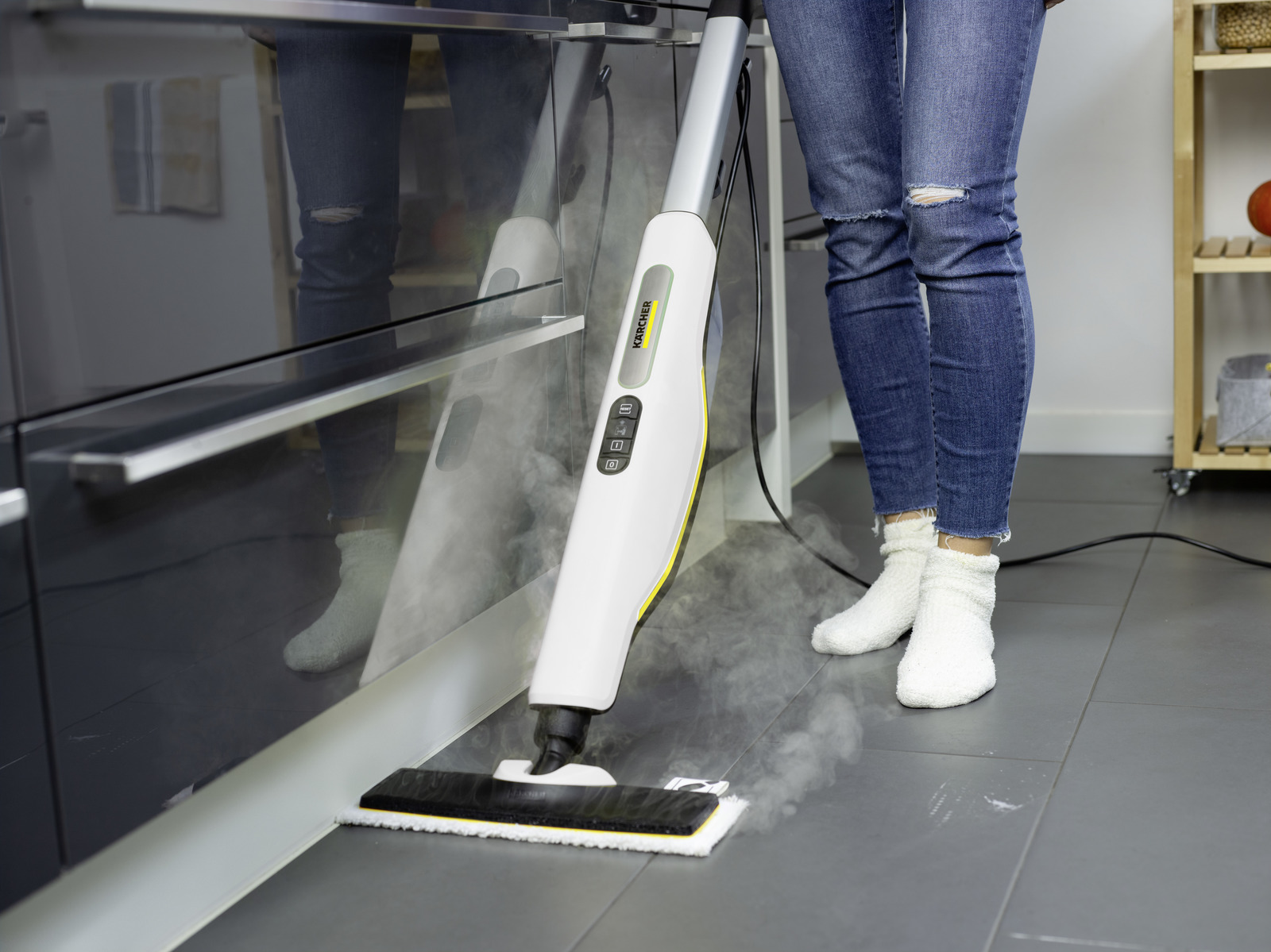 Using steam to tackle dirt: the Kärcher SC 2 Upright EasyFix cleans every sealed hard floor – even wood. With its preset and easy-to-operate steam flow control in 2 stages, thorough cleaning with the Kärcher steam cleaner removes up to 99.999% of coronaviruses* and 99.99% of all common household bacteria** from hard surfaces. The steam cleaner heats up in an instant and is immediately ready for use with a fillable and removable fresh water tank, incl. descaling cartridge. The operating status of the device is visible with the colour codes of the LEDs at the handle. The combination is perfect: for even more thorough cleaning and fast changeover of cloths without any contact with dirt, the Kärcher microfibre cloths are fastened to the floor nozzle EasyFix by means of a hook-and-loop fastener.