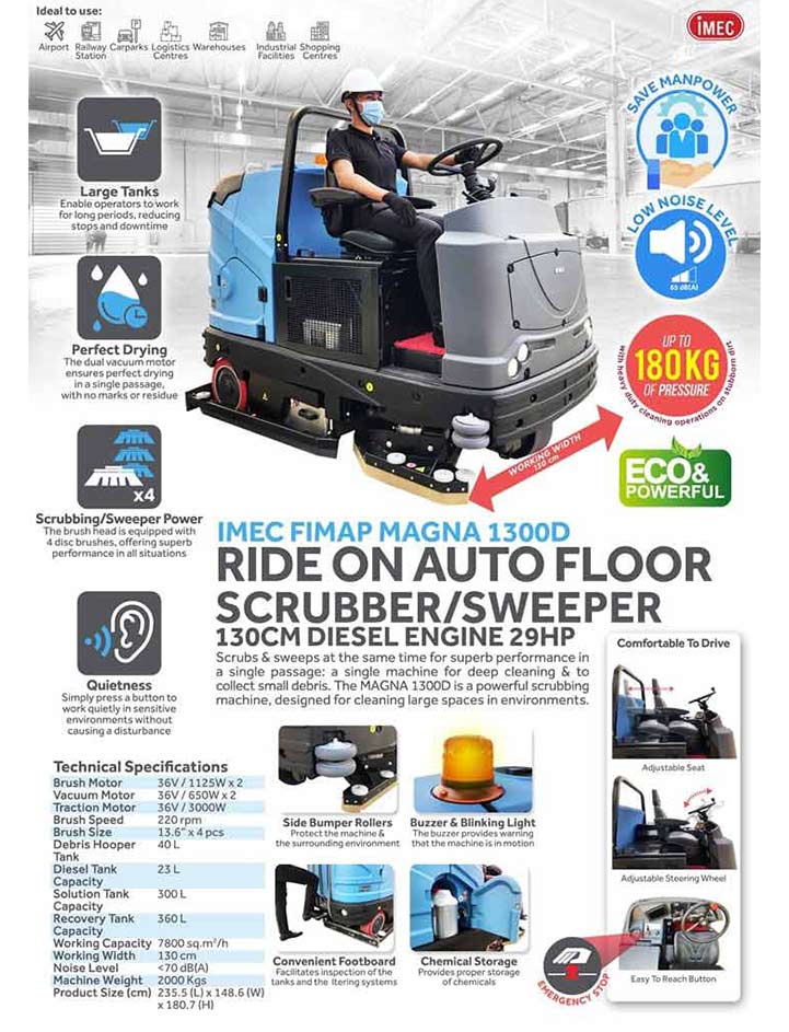 Top > Products > Cleaning Machines > SWEEPER > IMEC FIMAP MAGNA 1300D – RIDE ON AUTO-FLOOR SCRUBBER/SWEEPER, DIESEL DRIVEN