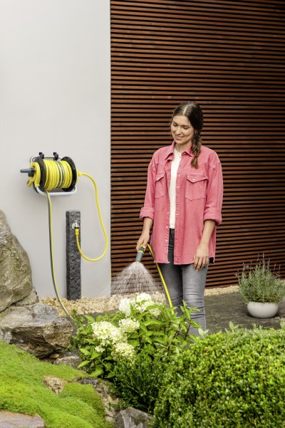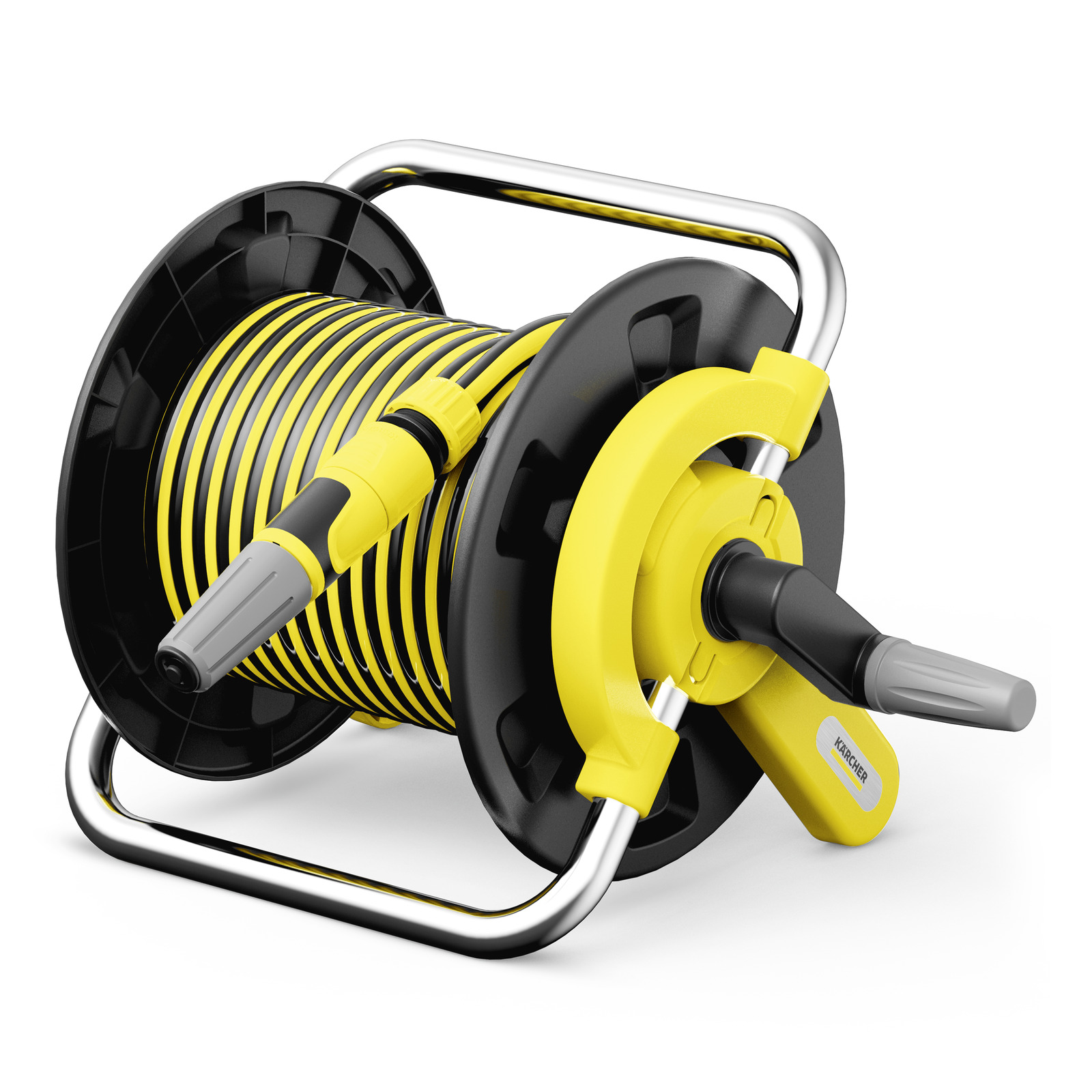 With wall bracket, locating screws, 15 m 1/2" PrimoFlex® hose, sprayer, 4 Universal hose connectors Plus (3 x 2.645-003.0, 1 x 2.645-004.0) and 3/4 tap adaptor.