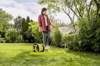 Ready to use. Hose reel HR 1.15 with rust-resistant frame. Includes wall bracket, 15 m + 2m 1/2" PrimoFlex® hose, spray nozzle, four Plus universal hose connectors, 3/4" thread tap connector.